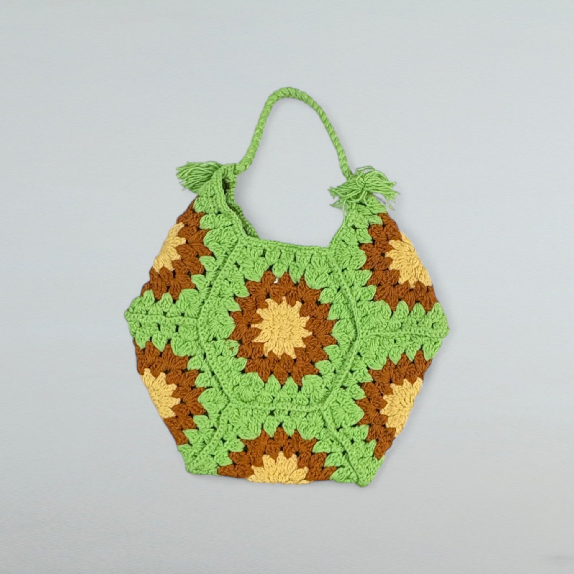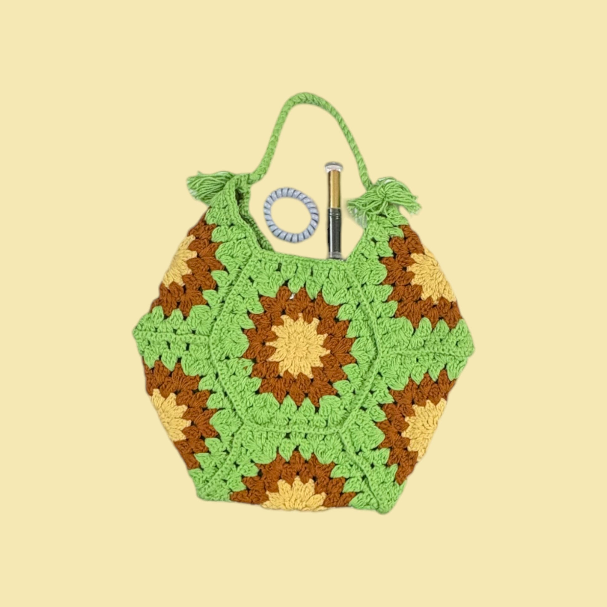 This handheld bag is expertly handcrafted using cotton yarn through crochet techniques. Its lightweight construction makes it an ideal choice for everyday use.