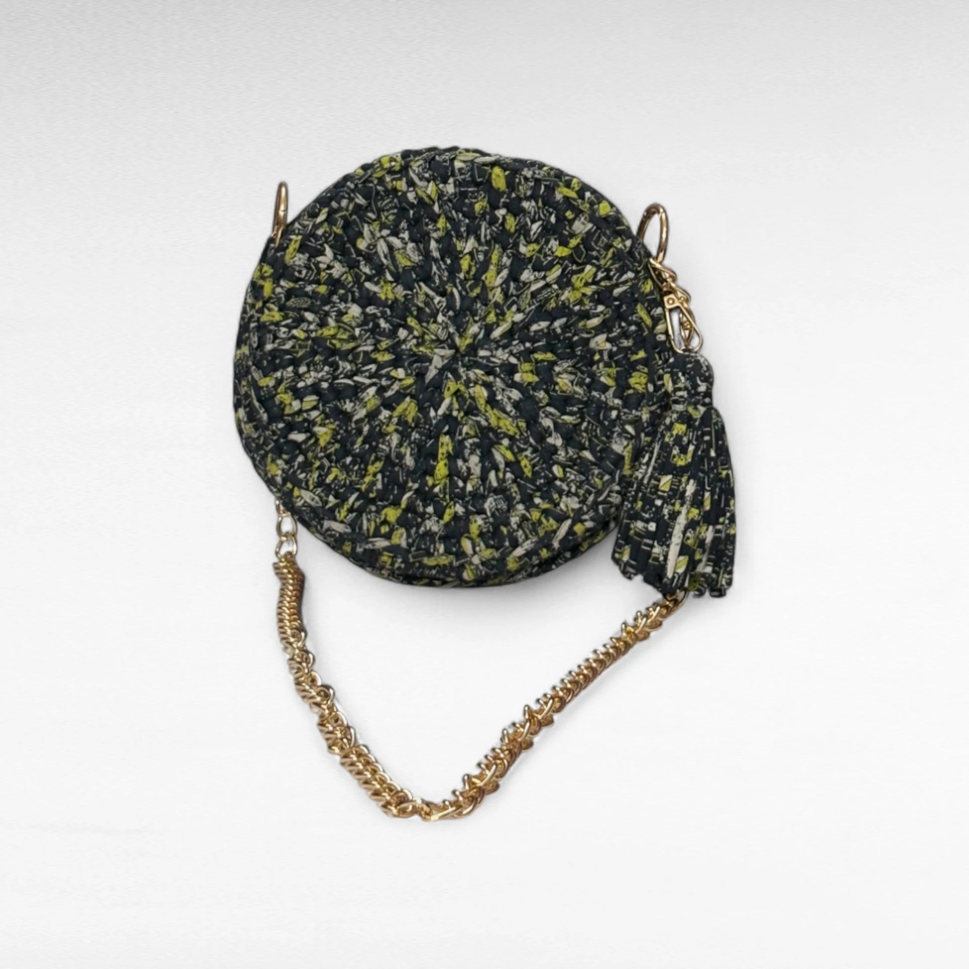 Our Textured Round Sling Bag combines everyday chic with artisanal craftsmanship. Made with cotton t-shirt yarn, this bag features a a playful tassel accent that gives it charm. Perfect for brunches, shopping, or casual evenings out.