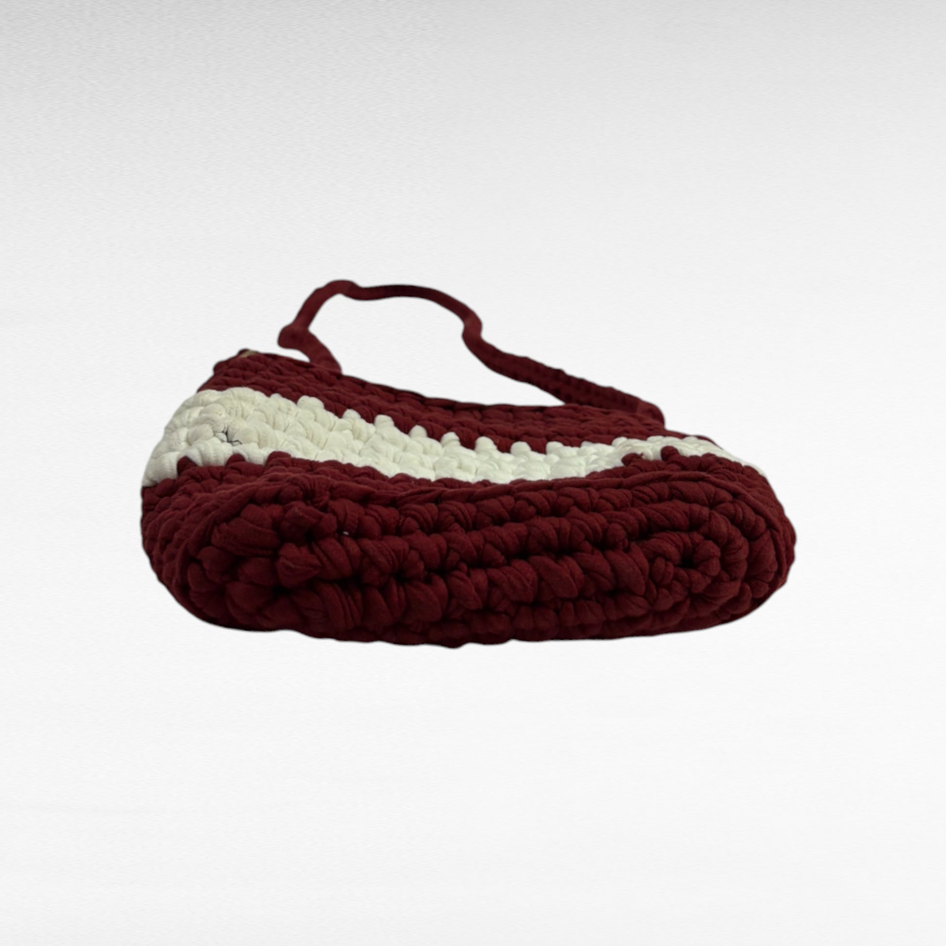 A compact crochet sling for everyday essentials. Handcrafted in deep red with a white center stripe, this mini bag adds a hint of vintage charm to your outfit. Lightweight, soft, and easy to carry makes it perfect for casual outings or gifting.