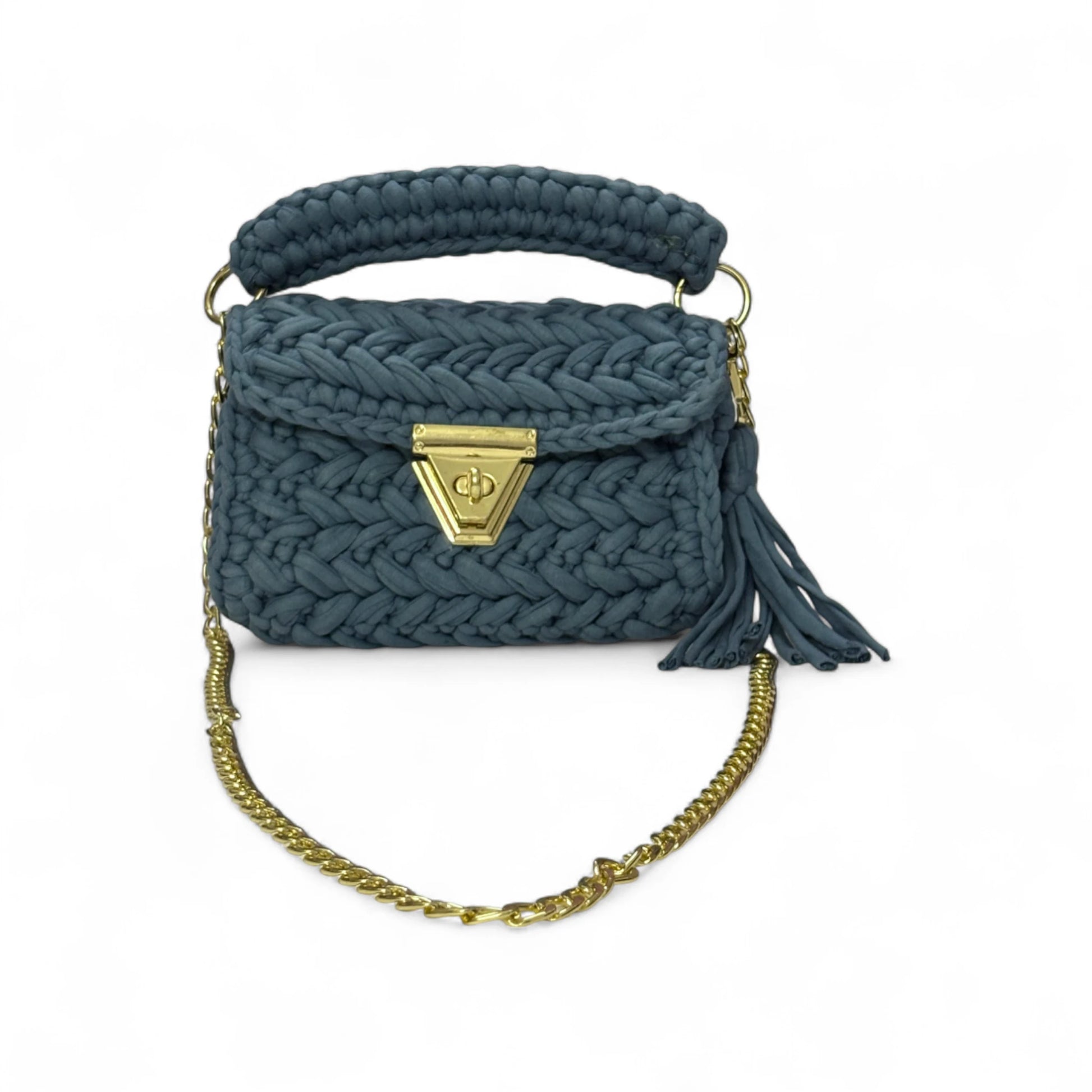 A handcrafted crochet bag made with 100% cotton t-shirt yarn that blends elegance with versatility.